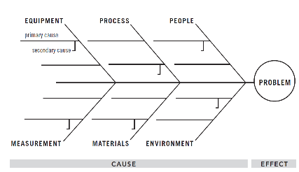 - Think backwards. The detective work to find potential causes requires structured thinking. A proven approach is to use the fishbone (also known as Ishikawa) diagram, as it provides a clean, graphic method of identifying potential factors causing a problem. As you can see, it looks like a fish skeleton, with the large bones each representing a main causal area, typically equipment, process, people, measurement, materials, and environment. Specific potential causes are added to each appropriate area of the skeleton. The fishbone diagram encourages you to “think backwards”—to look for the issues that underlie the observable problem.